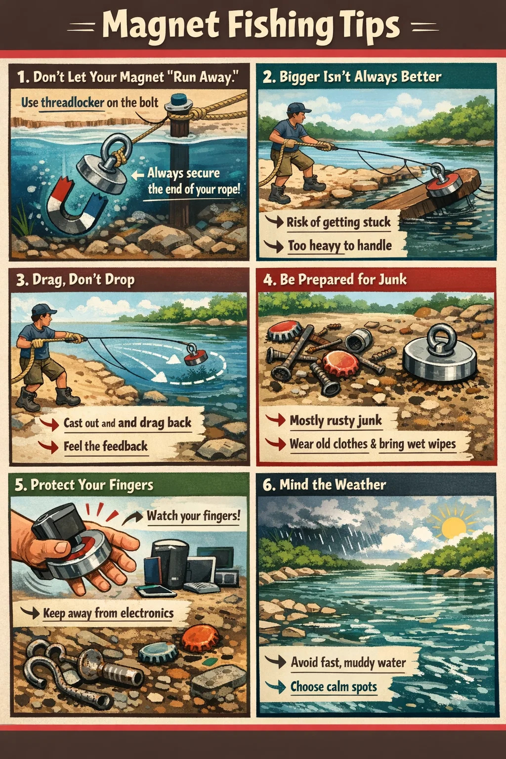 Molte persone, quando iniziano per la prima volta a pescare con i magneti, pensano che tutto ciò che devono fare è lanciare un magnete nell’acqua. Ma dopo alcuni tentativi, tutti si lamenteranno: "Se solo avessi saputo prima questi suggerimenti!"