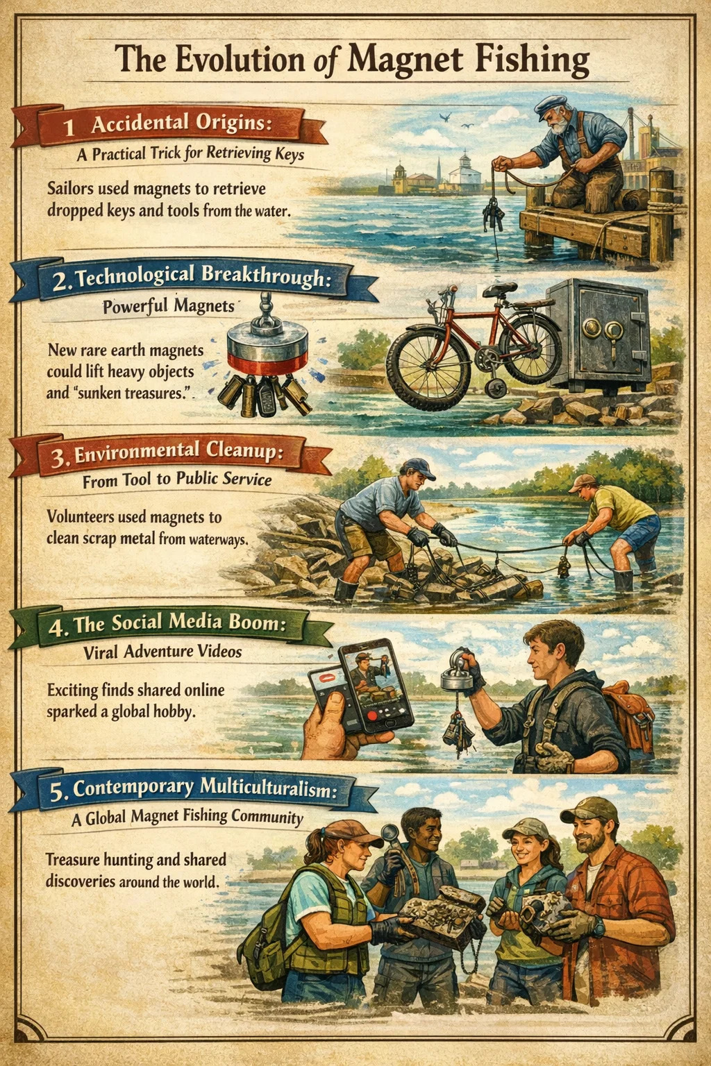 Comunità globale: Al giorno d'oggi, esistono comunità dedicate in tutto il mondo in cui le persone condividono consigli sull'attrezzatura e le ultime scoperte, trasformando la pesca magnetica da uno strumento di nicchia in un collegamento che collega le persone con la natura e la storia.